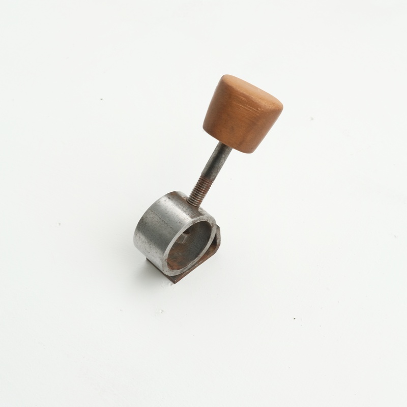 I designed this nutcracker as a Christmas present for my parents several years ago. Using a cutoff piece of steel pipe I drilled a hole and threaded it, screwing a steel rod through with a nut on the end to secure the nuts. I then drilled a handle onto it which I sanded and beeswaxed to create the finished product, using epoxy resin to glue it to a stand.